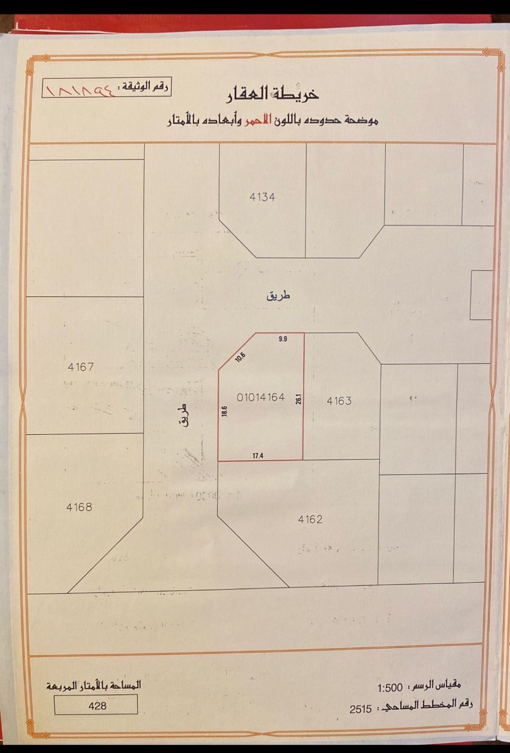 A commercial land for sale in Al-Hadd, near Sheikh Khalifa Park. The land area is 428 square meters. The price per square foot is 40 dinars, negotiable.