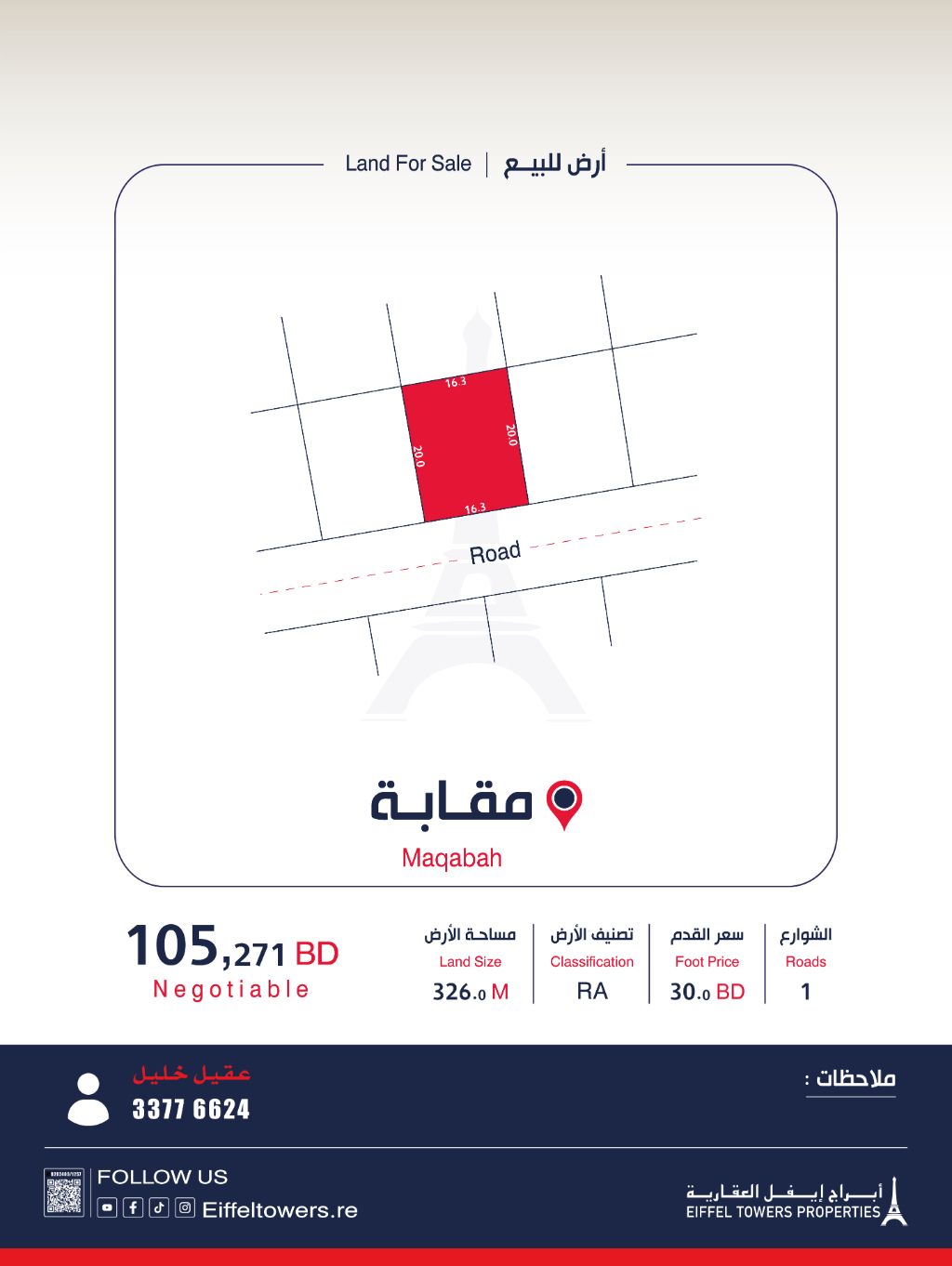 Eiffel Towers Real Estate Company offers a land plot for sale. The area is 326 square meters, classified as private residential (A RA). The price per square foot is 30 Bahraini dinars, with a total price of 105,271 Bahraini dinars. For contact, reach out to Aqeel Khalil via eiffeltowers.re. The company is a certified broker licensed by the Real Estate Regulatory Authority under license number B202403/1257.