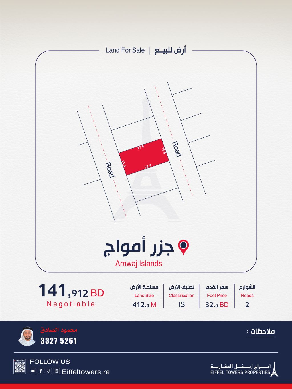 Eiffel Towers Real Estate Company offers for sale a land plot in Amwaj Islands with an area of 412 square meters. Classification: Special Nature Project Areas - SP. Price per square foot: 32 Bahraini dinars. Total price: 141,912 Bahraini dinars. For contact: Mahmoud Al-Sadiq, eiffeltowers.re, eiffeltowers.re. Licensed broker approved by the Real Estate Regulatory Authority, license number B202403/1257.