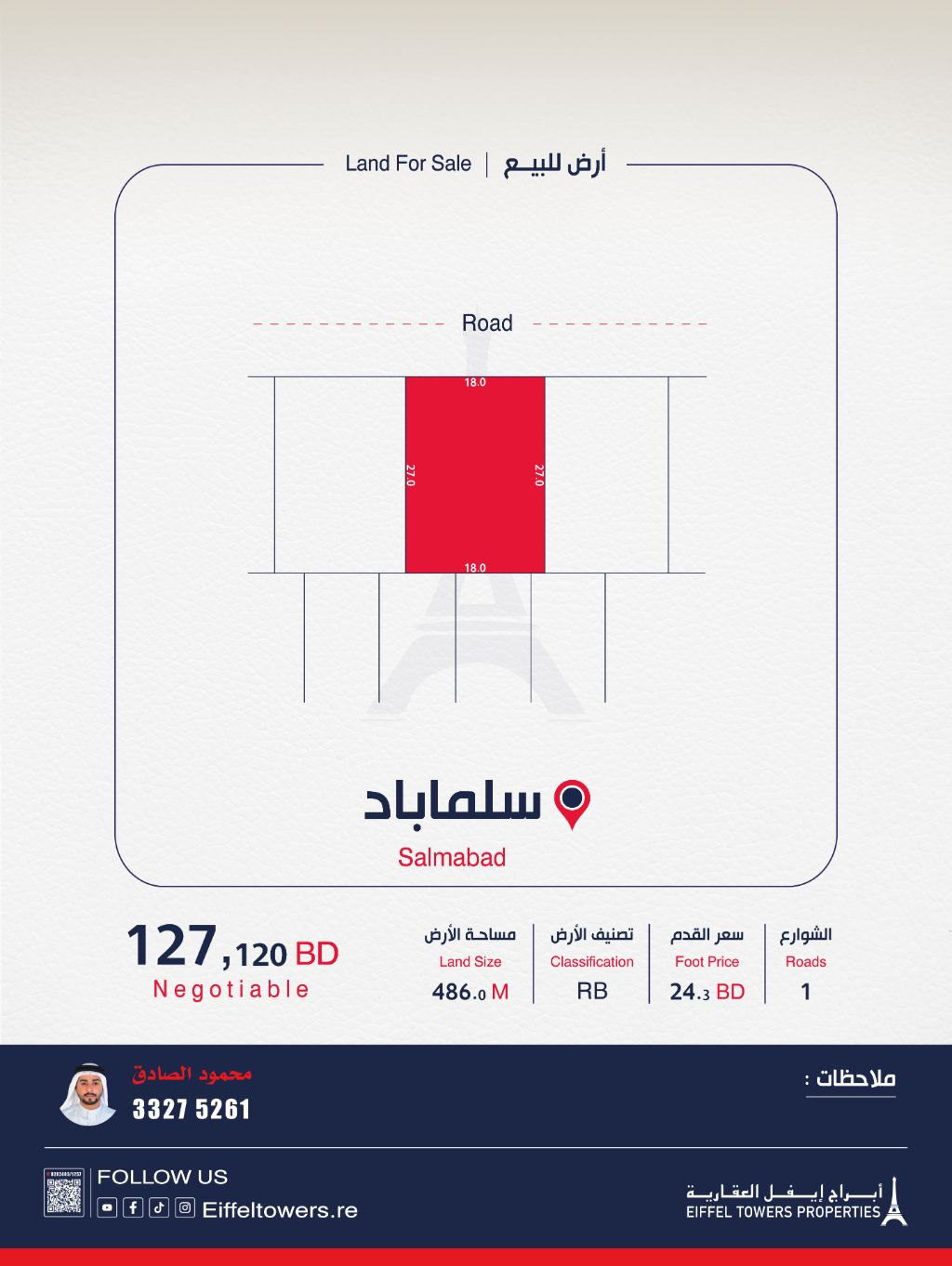 Eiffel Towers Real Estate Company offers for sale a land in Salmabad with an area of 486 square meters, classified as private residential. The price per square foot is 24.3 Bahraini dinars, and the total price is 127,000 Bahraini dinars. For contact, reach out to Mahmoud Al-Sadiq via eiffeltowers.re. The company is a licensed broker approved by the Real Estate Regulatory Authority, with license number B202403/1257.