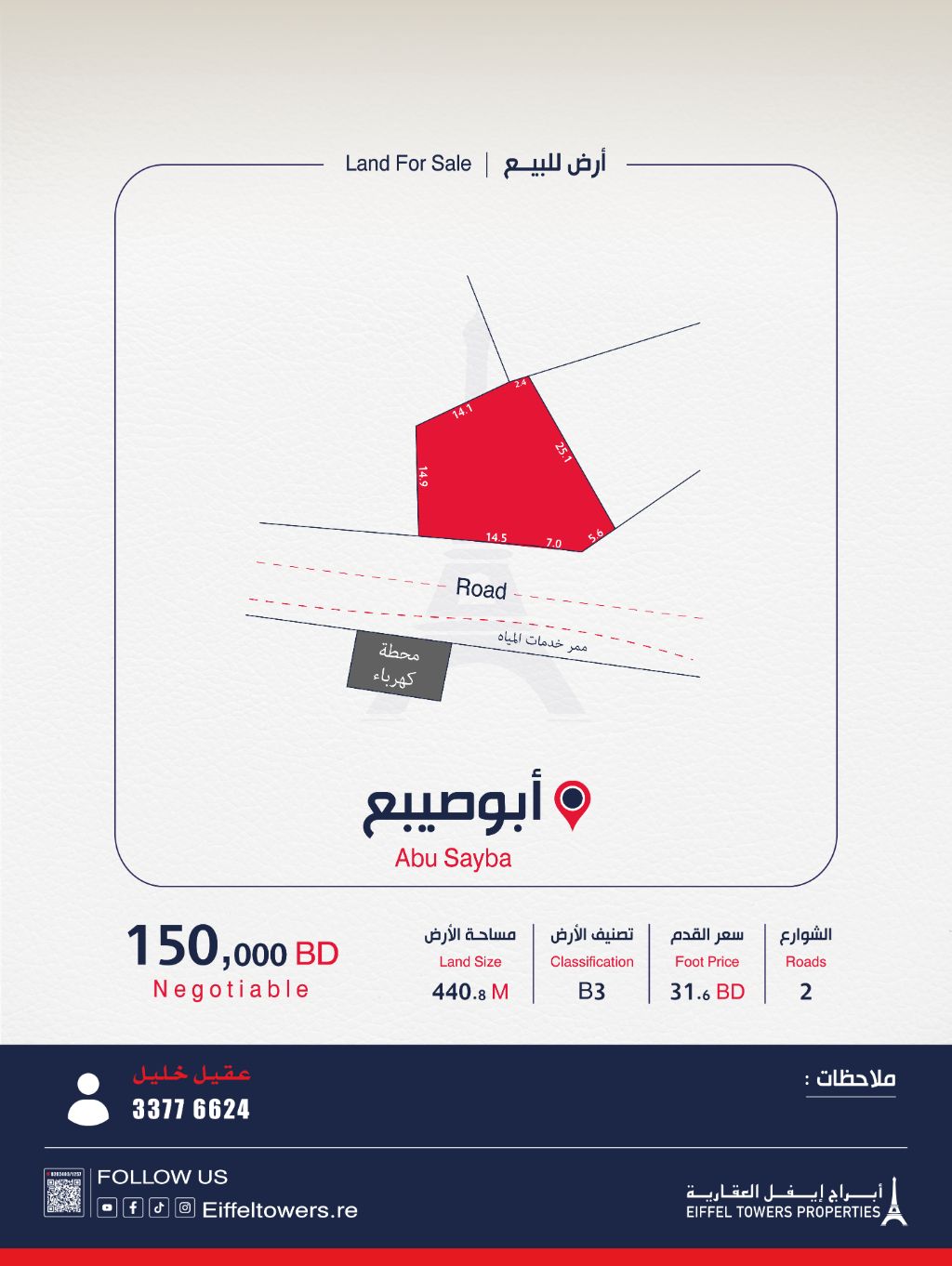 Eiffel Towers Real Estate Company for sale: land in Abu Saiba, area 440.8 sqm, classification: multi-use buildings, 3 floors - B3, price per square foot 31.6 BD, total price 150,000 BD. For contact: Aqeel Khalil, eiffeltowers.re, eiffeltowers.re, a licensed broker by the Real Estate Regulatory Authority, license number B202403/1257.