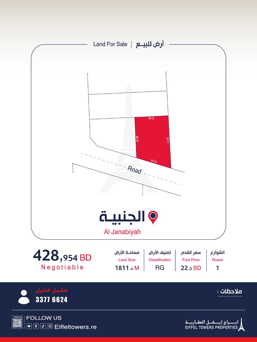 Eiffel Towers Real Estate Company offers for sale a land in Janabiya with an area of 1811.4 square meters, classified as residential garden - RG, price per foot 22 BD, total price 428,954 BD. For contact: Aqeel Khalil, eiffeltowers.re, a licensed broker by the Real Estate Regulatory Authority, license number B202403/1257.