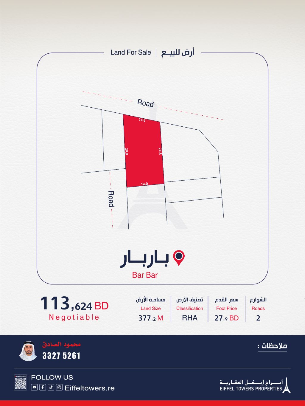 Eiffel Towers Real Estate Company offers for sale a land in Barbar with an area of 377.2 square meters. Classification: Residential attached (ARHA). Price per square foot: 27.9 Bahraini dinars. Total price: 113,624 Bahraini dinars. For contact: Mahmoud Al-Sadiq, eiffeltowers.re. Licensed broker approved by the Real Estate Regulatory Authority, license number B202403/1257.