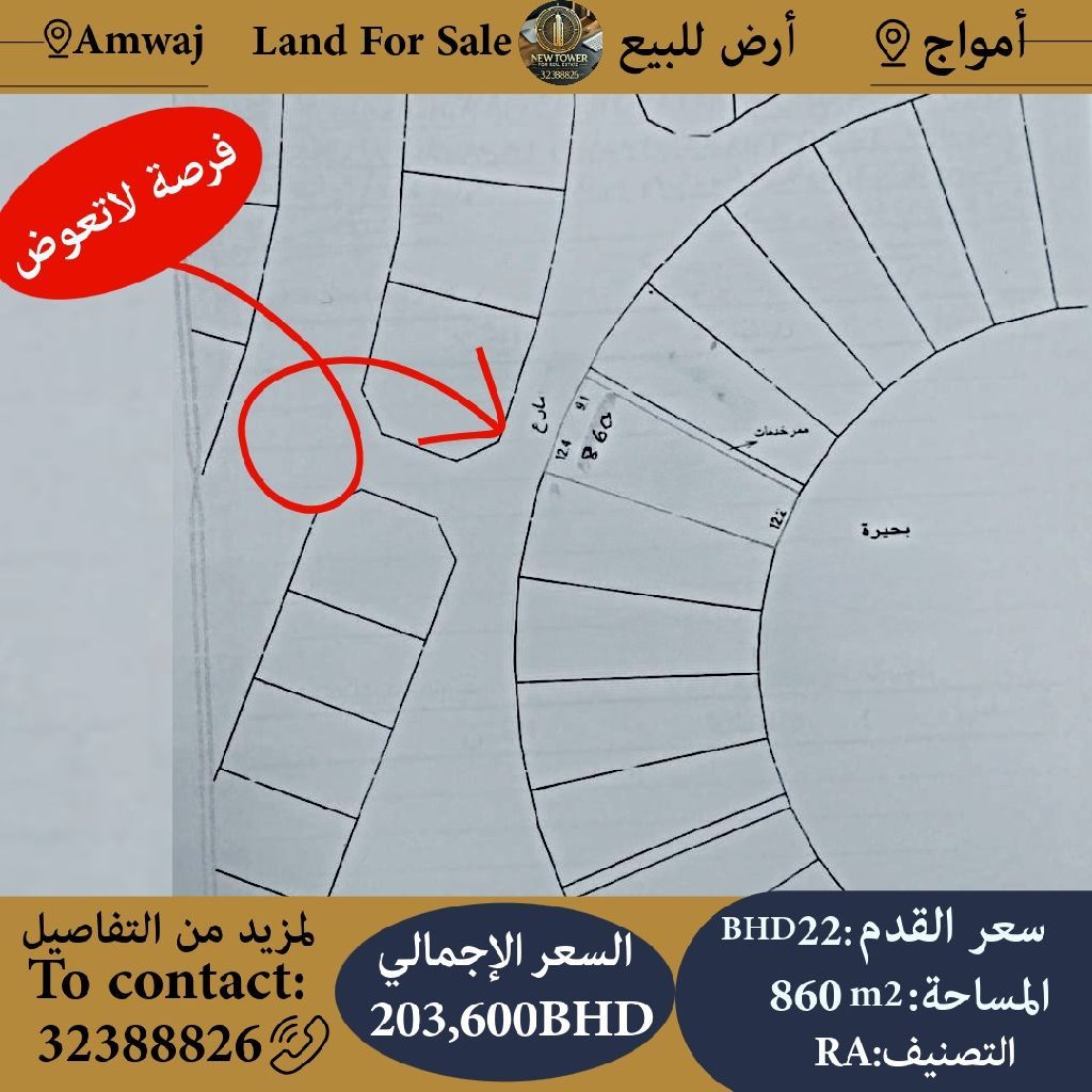 For sale, a land in Amwaj with an excellent location overlooking the lake, on a street and a passage. The area is 860 square meters, classified as residential RA. The price per square foot is 22 Bahraini dinars, and the total price is 203,600 Bahraini dinars. For contact, New Tower Real Estate Office.
