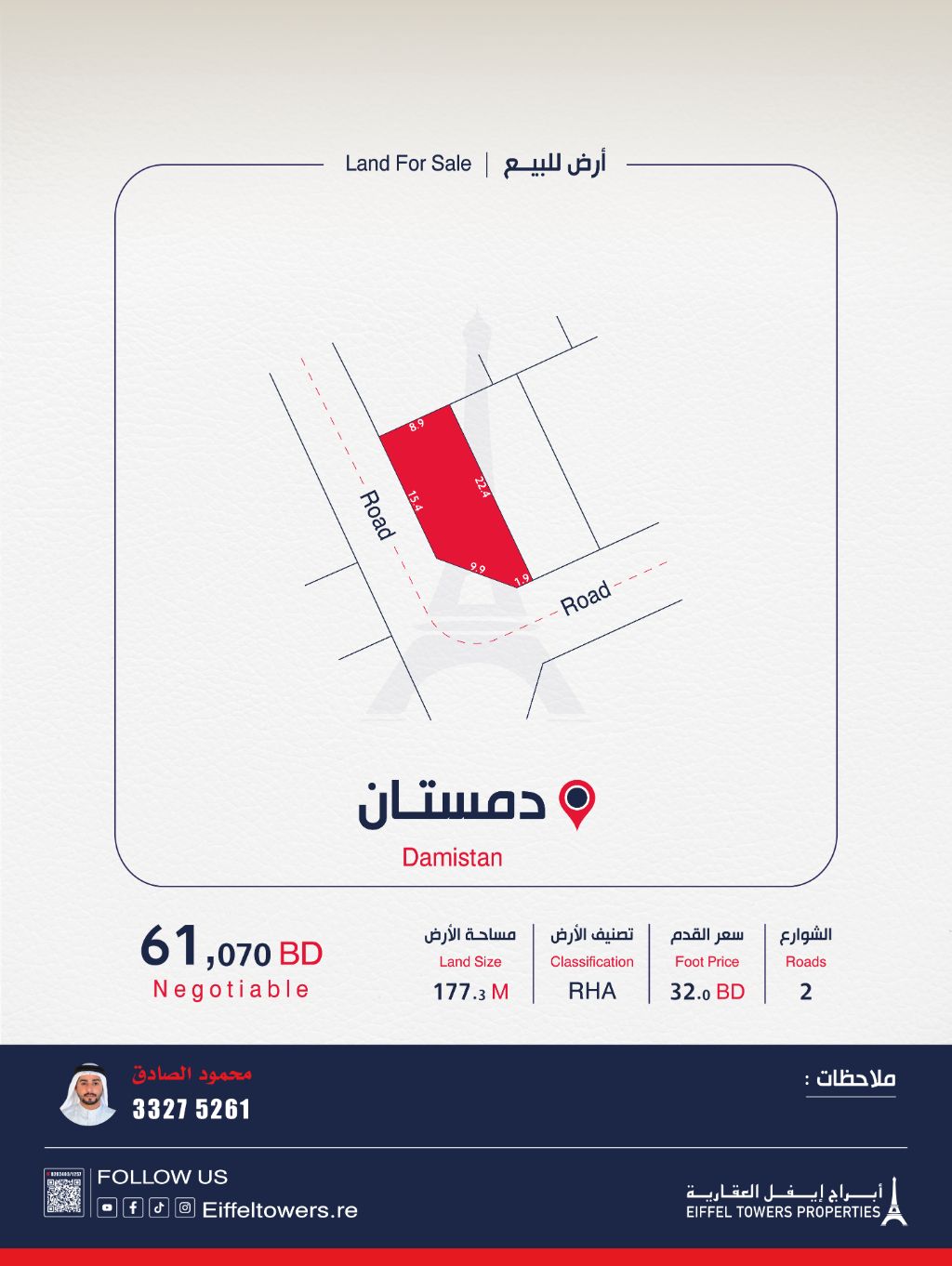 Eiffel Towers Real Estate Company offers for sale a land in Damistan with an area of 177.3 square meters. Classification: Residential attached (A RHA). Price per square foot: 32 Bahraini dinars. Total price: 61,070 Bahraini dinars. For contact: Mahmoud Al-Sadiq, eiffeltowers.re, eiffeltowers.re. Licensed broker approved by the Real Estate Regulatory Authority, license number B202403/1257.