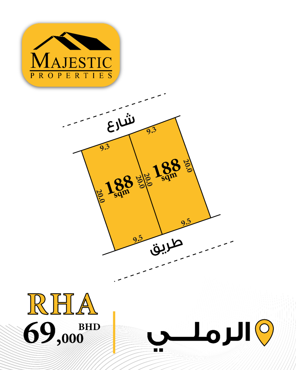 For sale: Residential lands in Al-Rumaili, near Al-Rumaili Housing. Land classification: RHA. Price per square foot: 34 Bahraini Dinars. Area of the first land: 188.6 square meters. Total price: 69,000 Bahraini Dinars. Area of the second land: 188.7 square meters. Total price: 69,000 Bahraini Dinars. Reference: MPM3422.