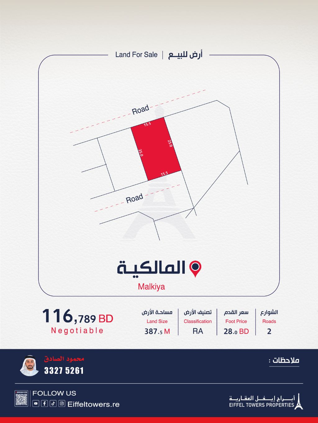 Eiffel Towers Real Estate Company offers for sale a land in Al-Malikiyya with an area of 387.5 square meters, classified as private residential (A RA). The price per square foot is 28 Bahraini dinars, and the total price is 116,789 Bahraini dinars. For contact, reach out to Mahmoud Al-Sadiq via eiffeltowers-re or eiffeltowers.re. The company is an intermediary licensed by the Real Estate Regulatory Authority under license number B202403/1257.