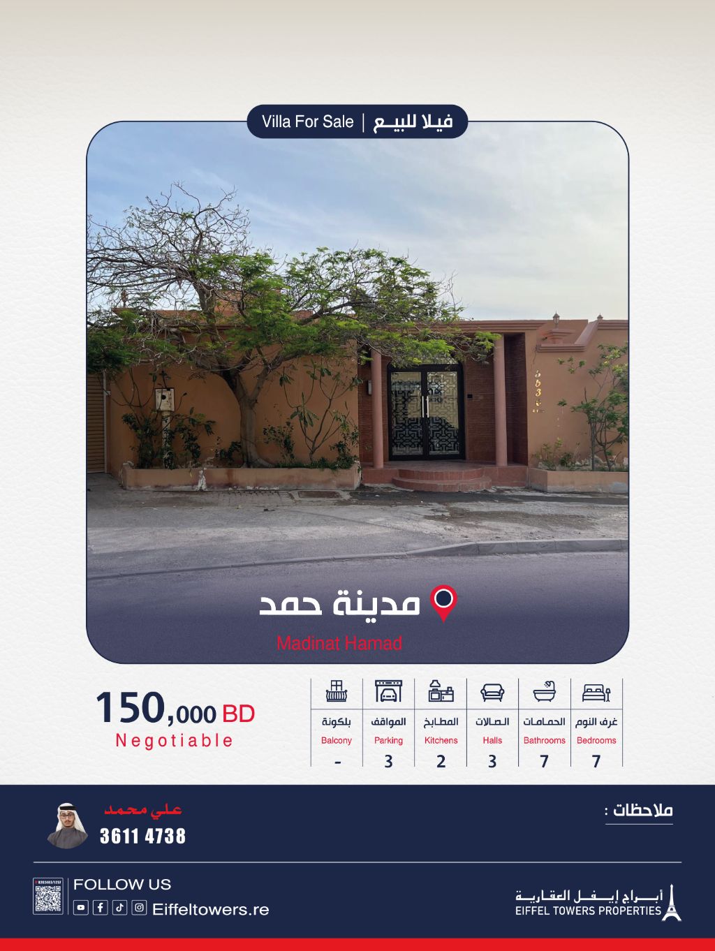 Eiffel Towers Real Estate Company offers a villa for sale in Hamad City, Roundabout 17. Land area: 510 sqm. Villa details: 7 bedrooms, 3 living rooms, 2 kitchens, 7 bathrooms, 1 parking space. Additional features: front garden, backyard, close to all services. Total price: 150,000 Bahraini dinars. For contact: Ali Muhammad, eiffeltowers.re, eiffeltowers.re. Licensed broker approved by the Real Estate Regulatory Authority, license number B202403/1257.