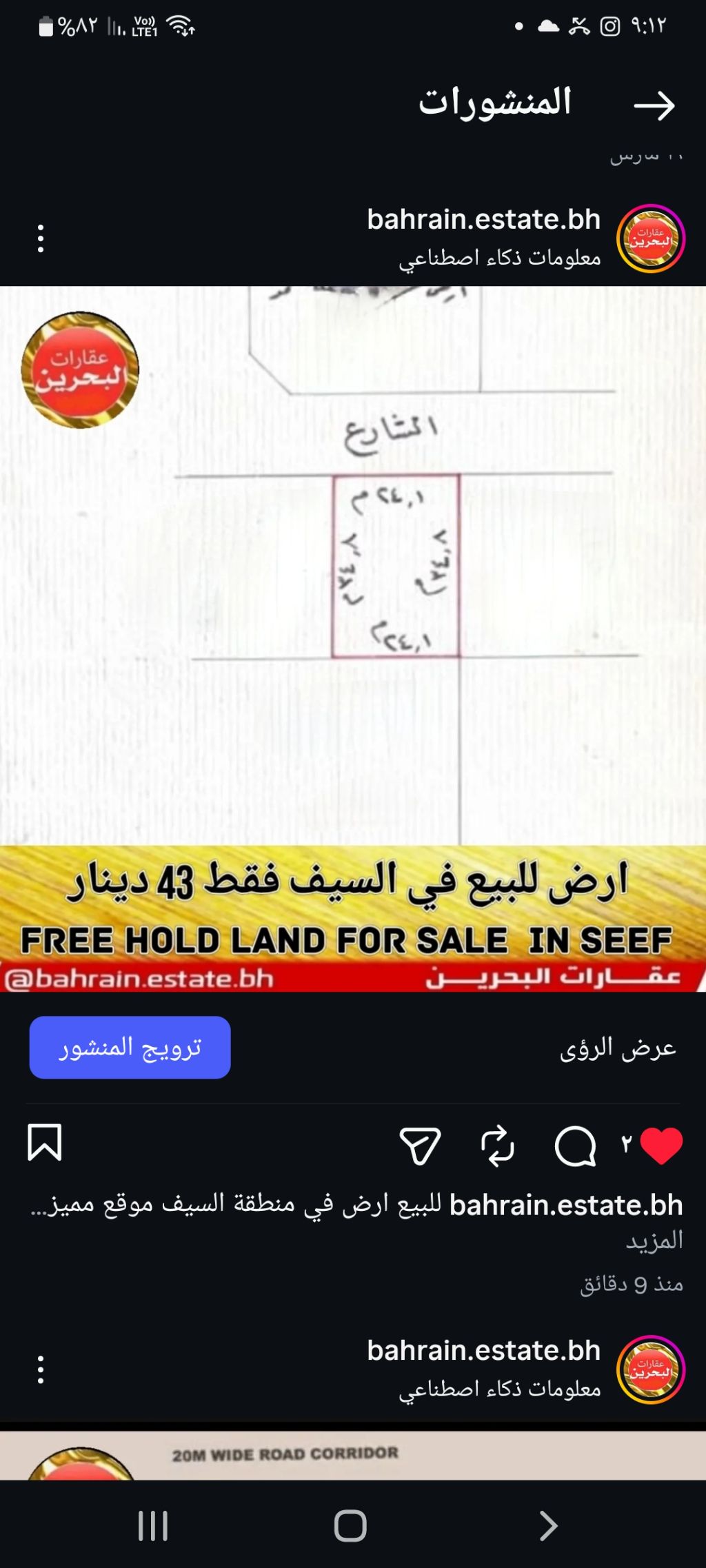For sale, a land in the Seef area, prime location and excellent price, opportunity. Area 837 square meters, classification 6 (floors). Price per square foot 43 dinars, total price 387 thousand.