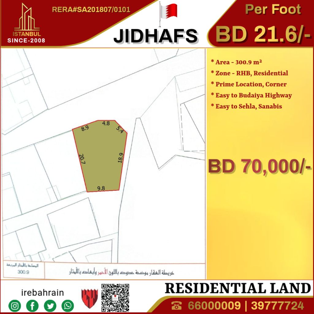 A residential land (RHB) for sale in Jidhafs for 70,000 Bahraini dinars. This distinguished residential land in the heart of Jidhafs is offered at only 70,000 Bahraini dinars, providing a rare opportunity to build your dream home or an income-generating residential project. The land extends over an area of 300.9 square meters and is classified under the RHB category, making it ideal for residential construction. Enjoy easy access to the Budaiya Highway, Sanabis, Sahla, and surrounding areas, combining the tranquility of the suburbs with convenient accessibility.