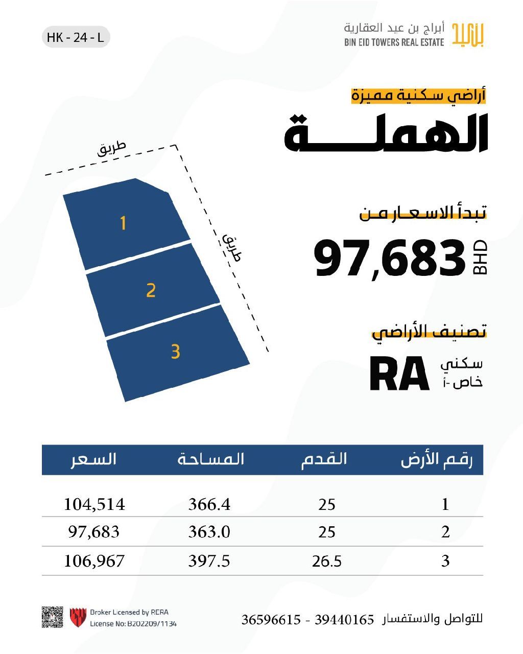 For sale, distinguished lands in Al Hamalah. Areas start from 363.0 square meters. Land classification: RA. Land type: Residential. Prices start from 97,683 thousand dinars. For reservation or inquiries, contact via social media accounts: ben - eid. bh, ben - eid. rent, beneid. cleaning, ben. eid - transport - Al Hamalah lands - for sale towers - Ben - Eid - Real Estate properties - Bahrain dream home.