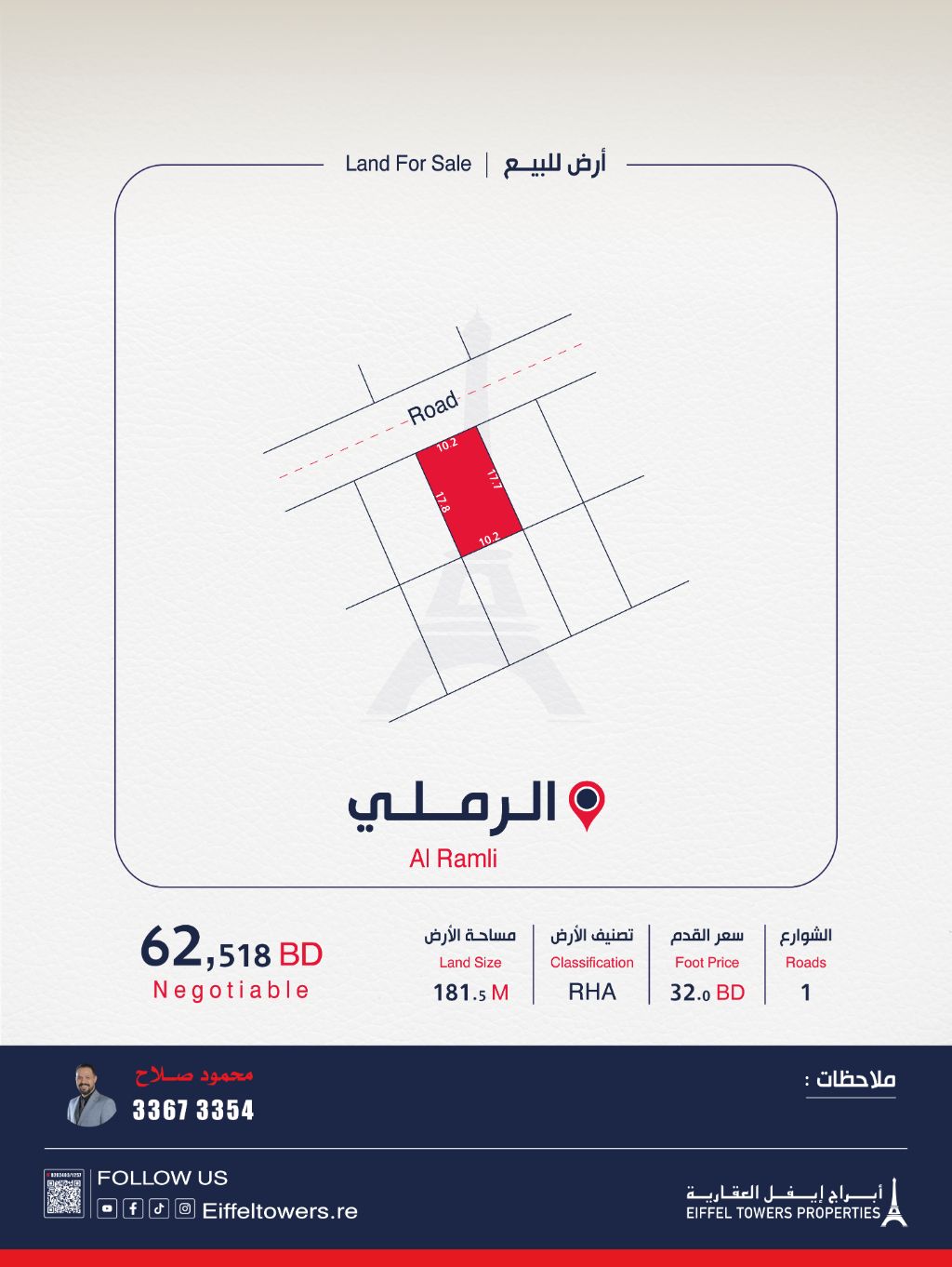 Eiffel Towers Real Estate Company offers for sale a land in Al-Ramli area. The area is 181.5 square meters, classified as residential attached (A RHA). Price per foot is 32 Bahraini dinars, total price is 62,518 Bahraini dinars. For contact: Mahmoud Salah, eiffeltowers-re, eiffeltowers.re, licensed broker approved by the Real Estate Regulatory Authority, license number B202403/1257.