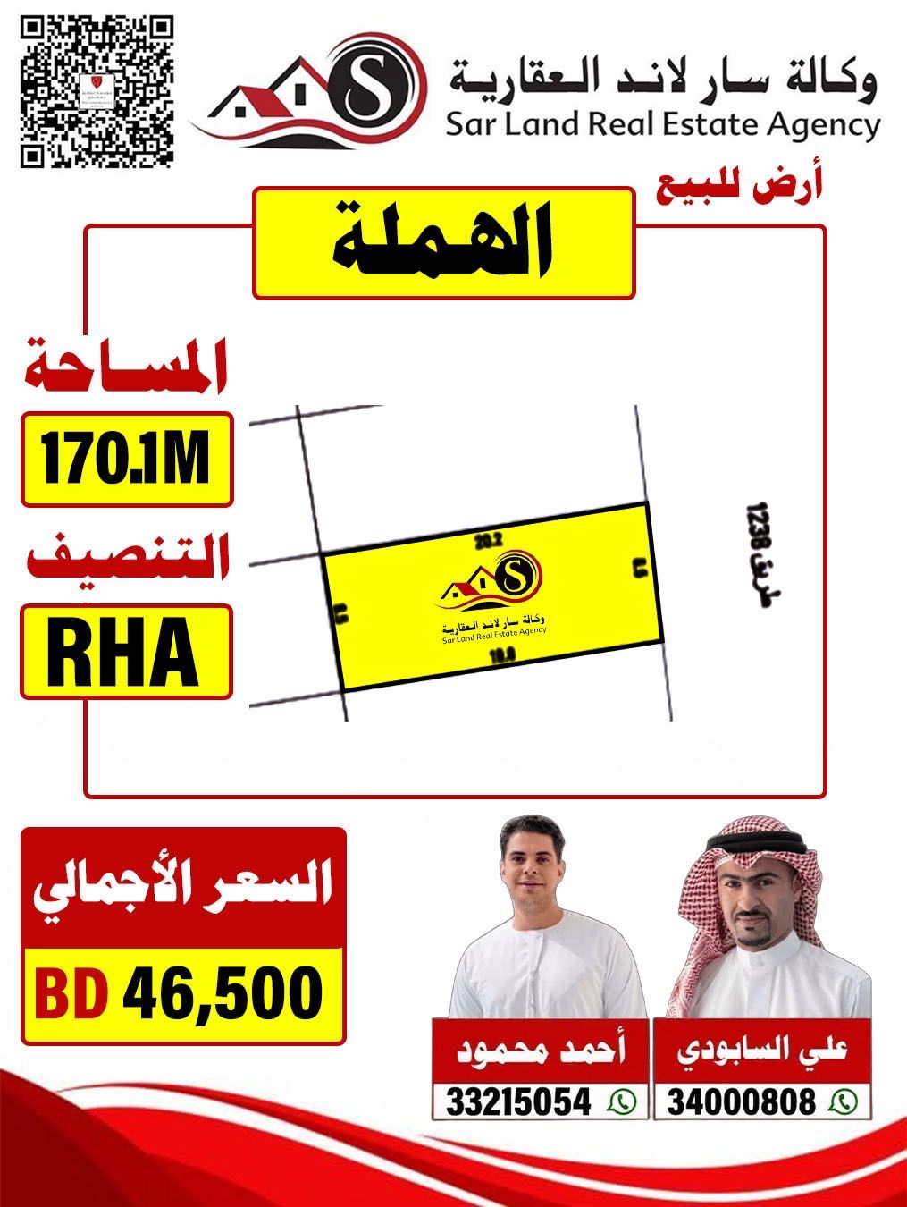 A residential land in Al Hamla with an area of 170 square meters, priced at 46,500 thousand.
