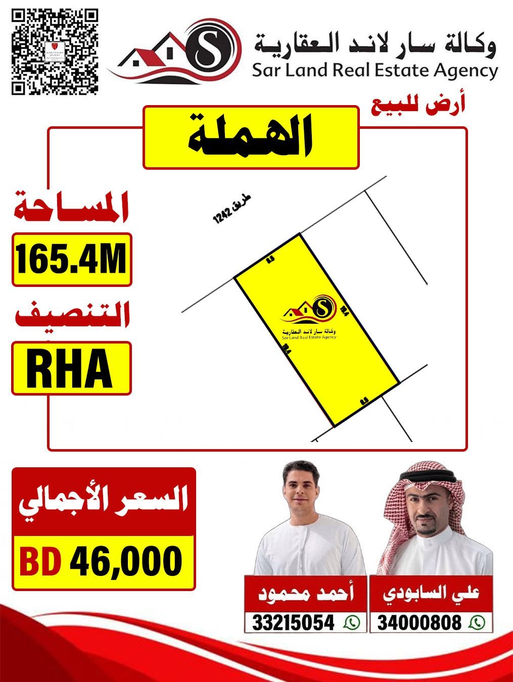 A residential land in Al Hamla with an area of 165 square meters, priced at 46 thousand dinars.