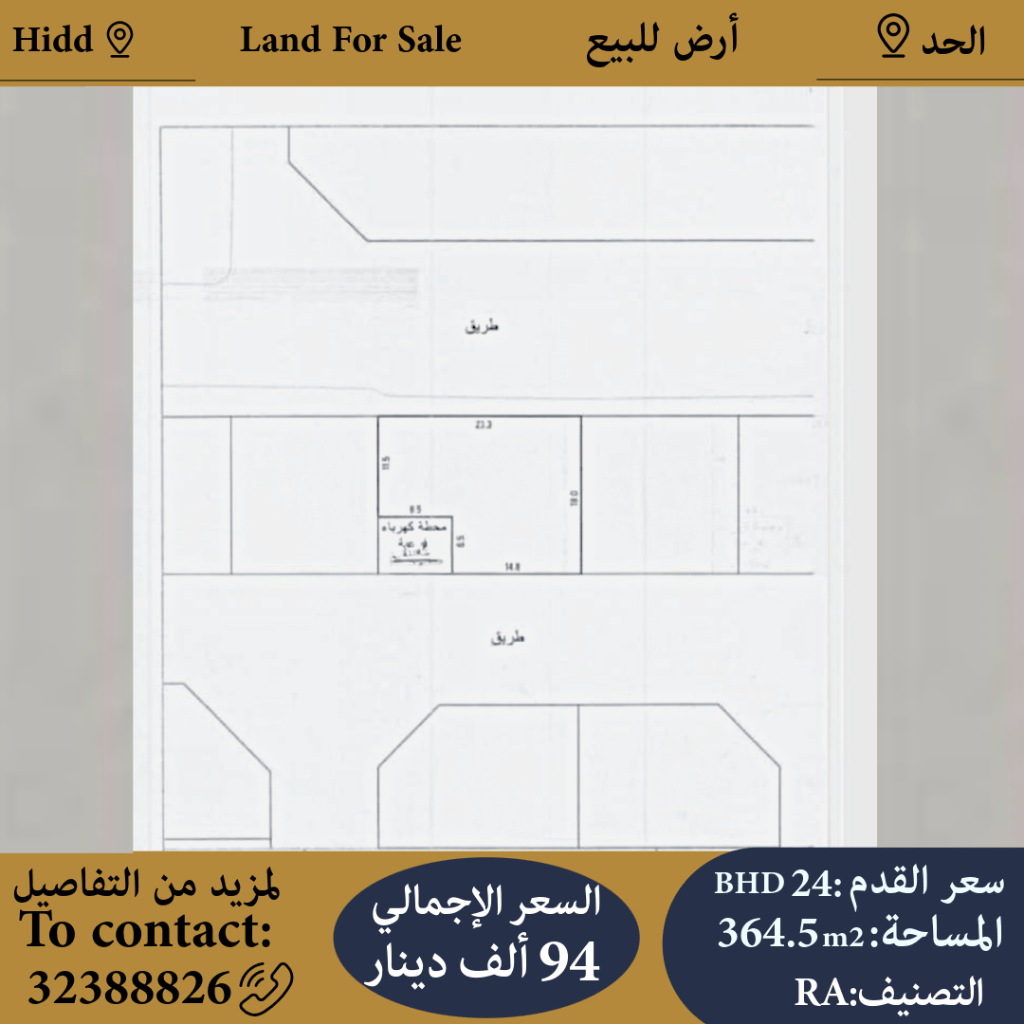 For sale: Residential land in Al-Hadd, classification RA, area 364.5 square meters, price per square foot 24 dinars, asking price 94,000 dinars. For contact.
