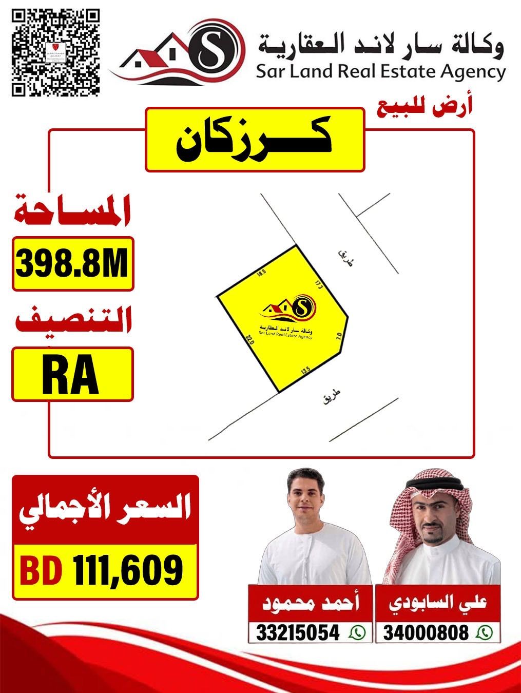 A distinguished land in Karzakhan with an excellent location and below market price. Area: 398 meters. Price: 26 dinars per foot.