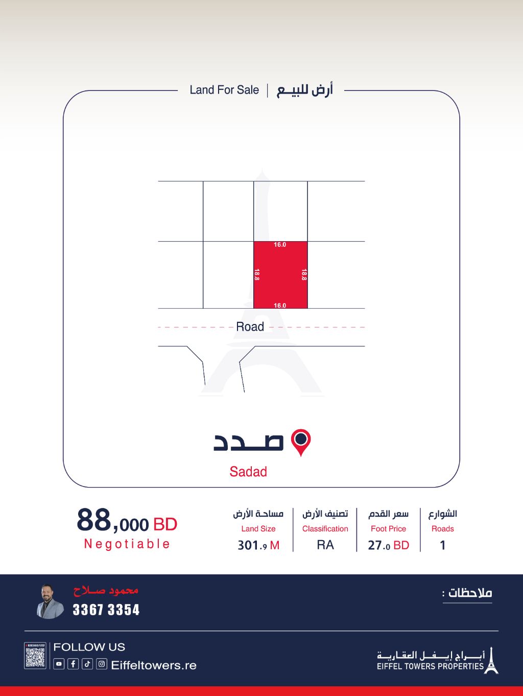 Eiffel Towers Real Estate Company for sale: Land in Saddad. Area: 301.9 sqm. Classification: Private residential (RA). Price per square foot: 27 BD. Total price: 88,000 BD. Contact: Mahmoud Salah. eiffeltowers - re eiffeltowers. re. Licensed broker by the Real Estate Regulatory Authority. License number: B202403 / 1257.