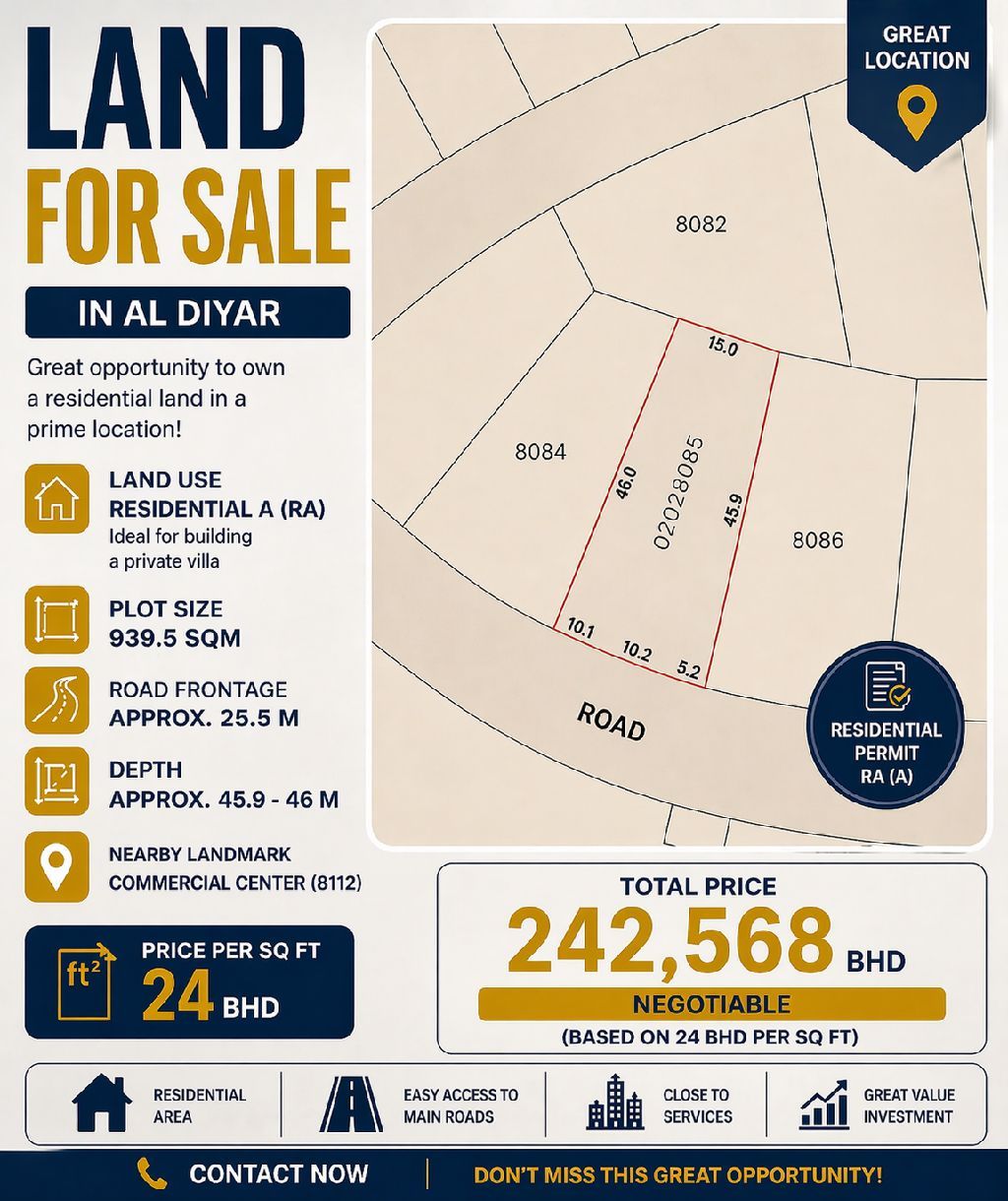 Residential land for sale in Al Diyar. A unique opportunity to own a residential land classified as RA (Residential A), suitable for building a private villa in a quiet location close to services. Area 939.5 square meters, frontage on the street about 25.5 meters, depth about 46 meters. Located on a street (slight corner), close to a shopping center. Price: 24 dinars per square foot, total price 242,568 Bahraini dinars (negotiable). Suitable for family living, good location with easy access.