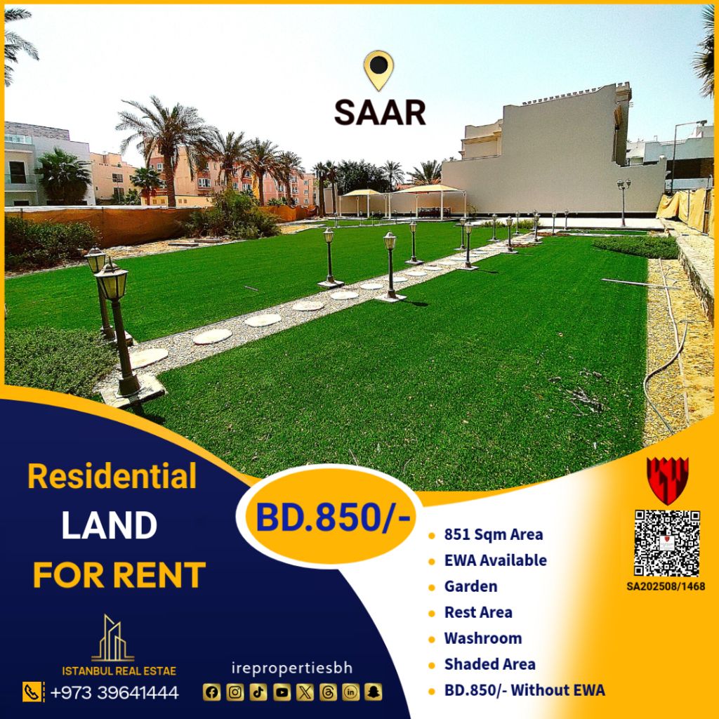 A residential land for rent in Saar, near Maqabah, for 800 Bahraini Dinars. This land is located in Saar, near the Maqabah area, in a prime location, with an area of 851 SQM. It includes electricity and water services, a fence, a garden, a rest area with a bathroom, and a shaded area with interlocking floors. easy access to Saar Mall, St. Christopher'School, Maqabah, Janabiyah, etc. We offer