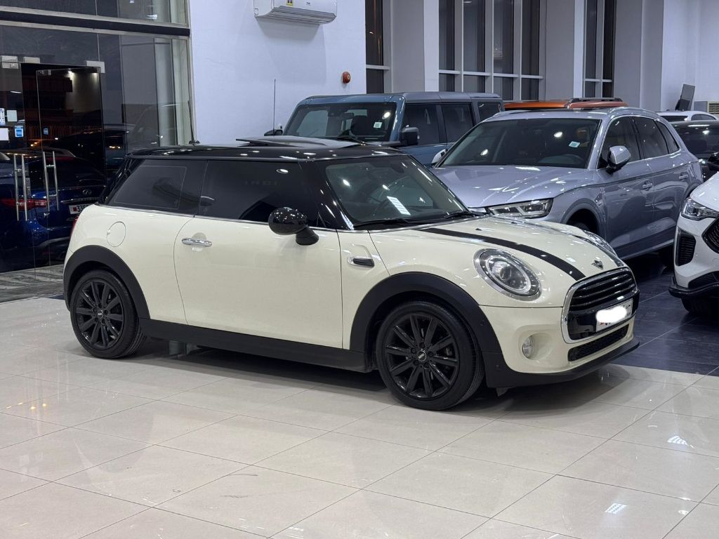 Mini Cooper 2019 (White) - Mileage: 63,150 km, Full Option: Alloy Wheels, Camera, Sensors, Bluetooth, Leather Seats, Cruise Control, Panoramic Roof, 3-Cylinder 1.5L Engine, 5 Seats. Price: BD 5,700 (Negotiable). Insurance valid until August 26 (Full). Agent maintained. Contact for details.