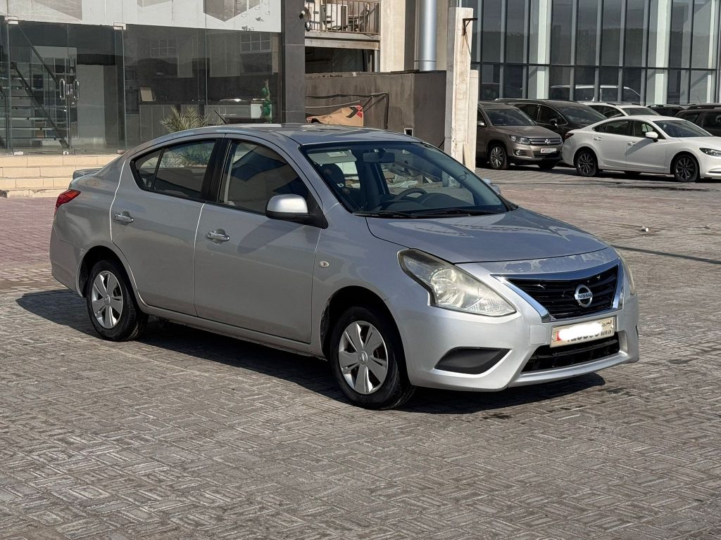 Nissan Sunny 2017 (Silver), Mileage: 156,550 km, Basic Option with Bluetooth, 4 Cylinders, 1.5L Engine, 5 Seats, Price: BD 2,400 (Negotiable), Insurance valid until July 2026. Contact for details.