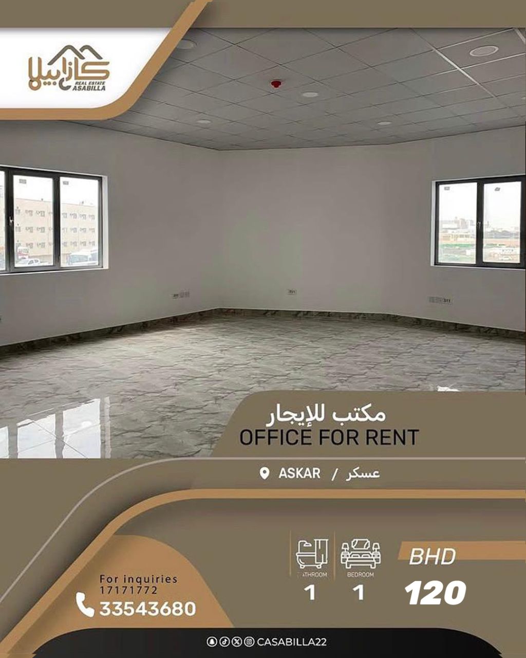 للإيجار: مكاتب تجارية في منطقة عسكر، تتكون من غرفة واحدة فقط. يوجد مصعد وحارس أمن. سعر الإيجار 120 دينار، باستثناء الكهرباء. للتواصل.