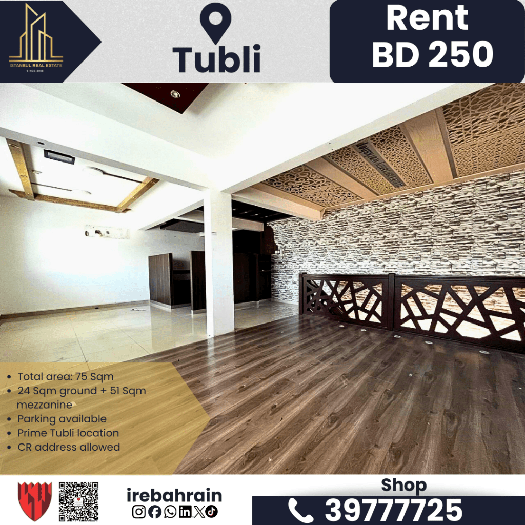 محل تجاري مع طابق نصفي للإيجار - توبلي بالقرب من مركز حسن محمود. الإيجار: 250 دينار بحريني. المساحة الإجمالية: 75 متر مربع - 24 متر مربع أرضي + 51 متر مربع طابق نصفي. مثالي لمحل تجاري أو مكتب تجارة. عنوان تجاري متاح. موقف سيارات متوفر. موقع متميز في توبلي. سهولة الوصول إلى سلماباد، مدينة عيسى، سند، وجسر المملكة العربية السعودية. 250 دينار بحريني شهرياً.