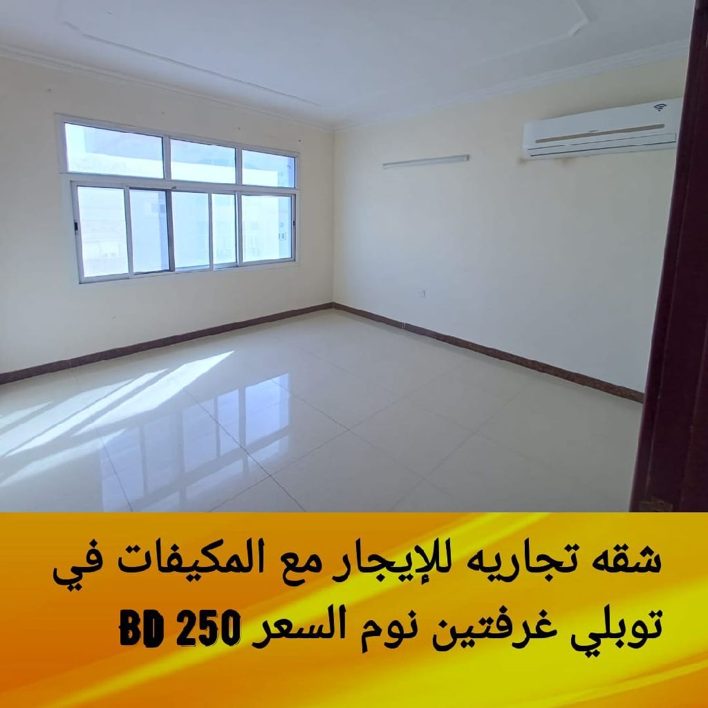 شقة تجارية للإيجار في توبلي، موقع ممتاز، مع مكيفات. تتكون من غرفتي نوم، حمامين، صالة، ومطبخ. يوجد مصعد وموقف خاص. السعر 250 دينار. للتواصل