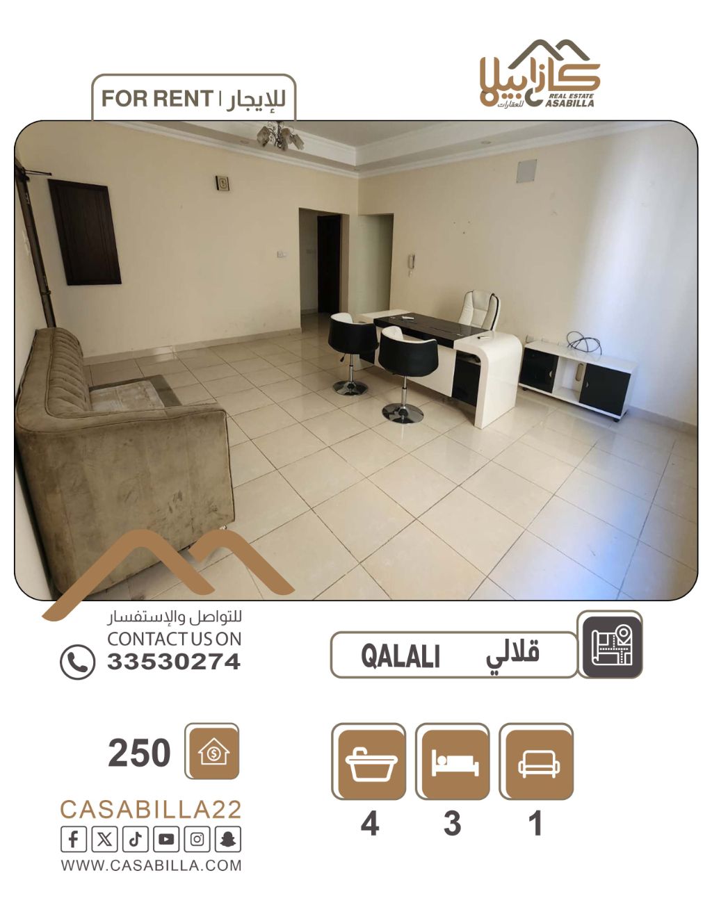 للإيجار: مكتب في قلالي - 250 دينار. مساحة واسعة في موقع حيوي بمنطقة قلالي. المواصفات: مكتب بثلاث غرف واسعة (جميعها ماستر)، 4 حمامات، مطبخ، صالة واسعة جداً. المرافق: يتوفر مصعد في المبنى، قريب من جميع الخدمات. سعر الإيجار: 250 دينار، غير شامل. للتواصل والاستفسار.
