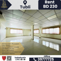 Commercial office for rent - Tubli, behind Ansar showroom. Area: 115 square meters - Open and spacious office design - Small kitchen and bathroom available - Ideal for office use - Laundry room address permitted - Prime location in Tubli - Easy access to Salmabad, Tubli main road, and highway - Rent: 230 Bahraini Dinars per month (excluding electricity and water fees).