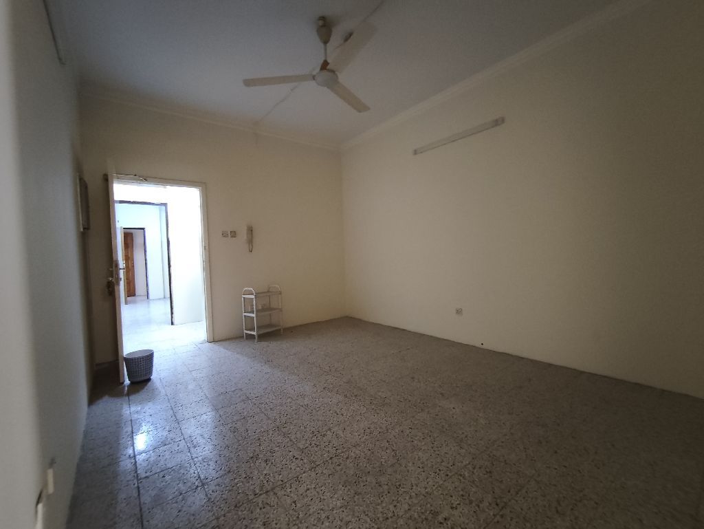 A spacious 2BHK office/commercial flat is available for rent in Qudaibiya. The rent is BD200 without Ewa. It has a separate water meter, a big hall, 2 rooms, 2 washrooms, 2 balconies, and a closed kitchen. An elevator is available. Reference number: K041203. Contact for details.