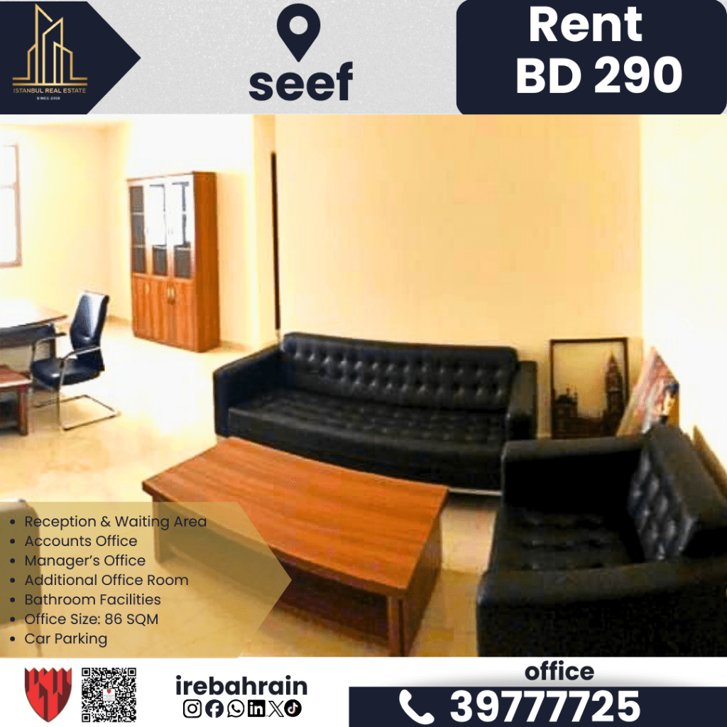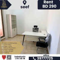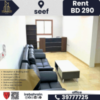 A fully equipped office for rent in the Seef area - for only 290 Bahraini dinars. A prime location in Seef, ready for work. Carefully designed office space, ideal for commercial or service companies. The office design includes a reception and waiting area, an accounts office, a manager's office, an additional office room, and bathrooms. The office area is 86 square meters. An elevator and parking are available. Any commercial address is available.
