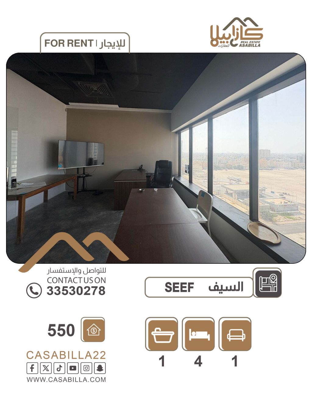 Office for rent in the Seef area. Spacious office spaces and complete facilities in Seef. Elevate your business in a strategic office that combines spaciousness and organization in the heart of the Seef area. The office features very large rooms and provides private storage space, offering a professional and comfortable work environment that meets the aspirations of companies and institutions seeking excellence and practicality. 4 large rooms + store, kitchen, reception, bathroom. Price 550 dinars. Electricity limit without electricity. For contact.