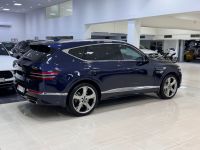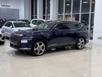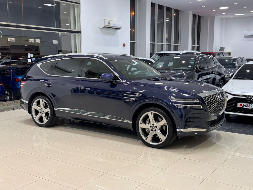 Genesis GV80 2021 model in blue color, with 44,000 km mileage. Full specifications include alloy wheels, sensors, Bluetooth, push-button start, 360-degree camera, panoramic sunroof, leather seats, and more. 6-cylinder, 3.5L engine, 5 seats. Price 18,000 Bahraini dinars (negotiable). Insurance valid until December 2025, under warranty until December 2025. Contact for more information.