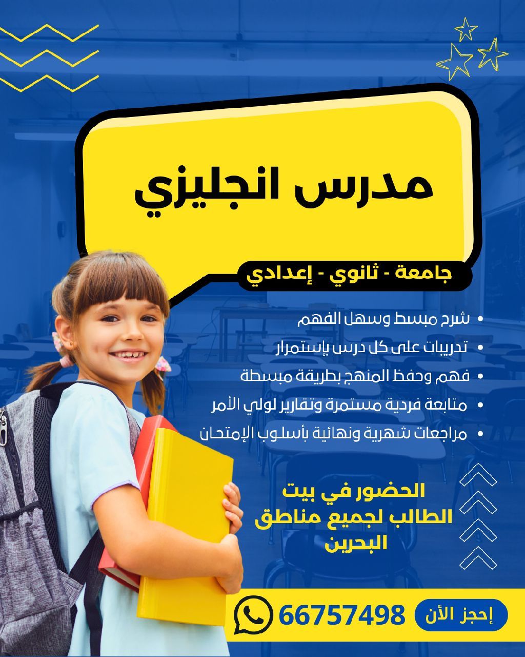 معلم لغة إنجليزية ذو خبرة واسعة في المناهج الحكومية والخاصة لجميع المراحل التعليمية والجامعة، يقدم تأسيساً قوياً للمادة، ومستعد للذهاب إلى جميع مناطق البحرين للتواصل.