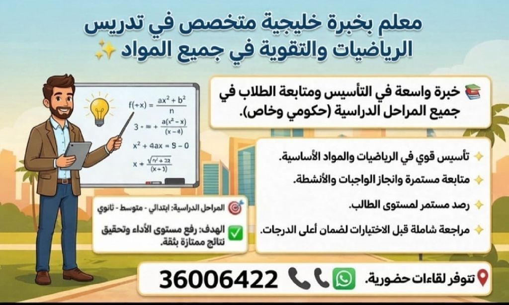 معلم رياضيات وفيزياء لجميع المدارس الخاصة. خبرة كبيرة في التدريس. معلم تربية خاصة بخبرة طويلة ومميزة. تدريس جميع المواد المدرسية. متابعة يومية للدروس. مساعدة في حل الواجبات. استعداد مكثف للاختبارات. خبرة في التعامل مع حالات صعوبات التعلم. تأسيس قوي وتقوية لجميع المراحل. إعداد للاختبارات. الموقع: منطقة المحرق. للتواصل. تعليم متميز، نتائج ملموسة بإذن الله.