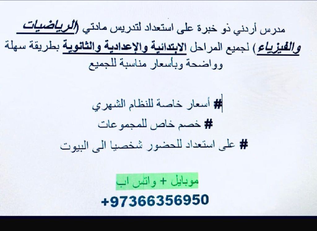 A Jordanian teacher with experience is ready to teach mathematics and physics for all primary, preparatory, and secondary stages at suitable prices for everyone.