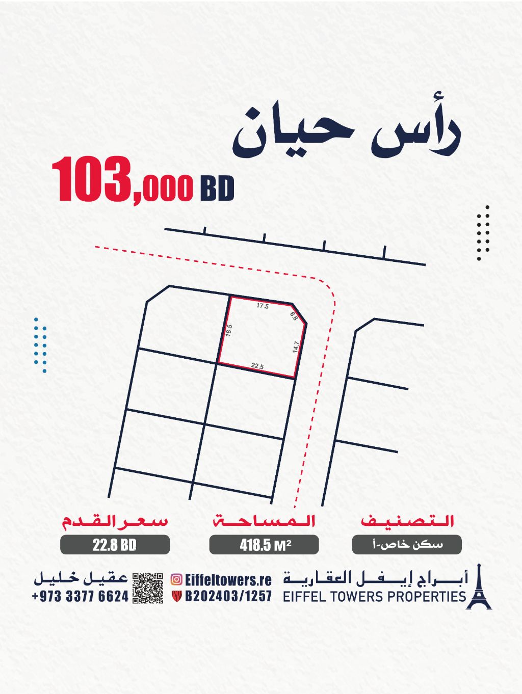 شركة أبراج أيفل العقارية تقدم للبيع أرضا في رأس حيان. المساحة 418.5 متر مربع، مصنفة كسكن خاص ( أ RA) سعر القدم 22.8 دينار بحريني، والسعر الاجمالي 103000 دينار بحريني. للتواصل، اتصل بعقيل خليل