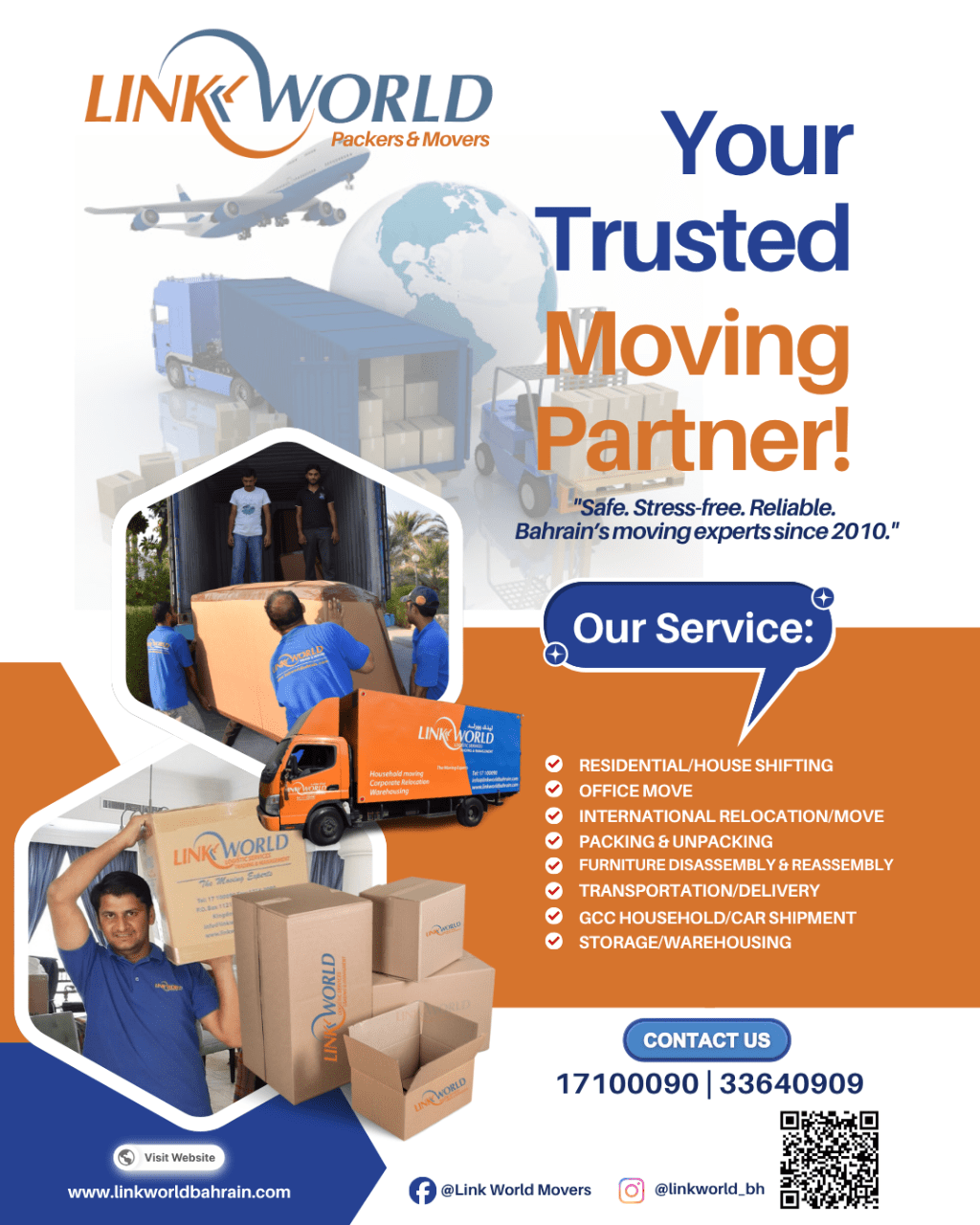 هل تنتقل إلى منزل جديد في البحرين؟ دعنا نتعامل مع الرفع الثقيل. سيكون Link World Packers and Movers سعداء بمساعدتك في عملية الانتقال، سواء في البحرين أو دول مجلس التعاون الخليجي أو غيرها. نحن واثقون من أن خبرة فريقنا ستساعد في جعل عملية التغيير تسير بسلاسة قدر الإمكان، من المنازل إلى المكاتب. لقد كنا ننقل البضائع بأمان منذ عام 2010. لدينا كل شيء.