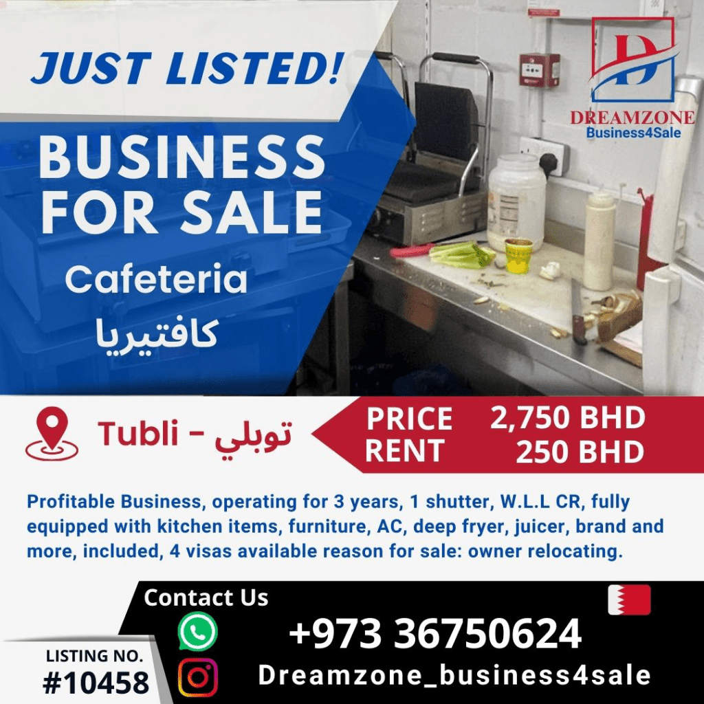 كافيتريا قائمة ومربحة للبيع في توبلي، إيجار منخفض، مجهزة بالكامل. الوضع المالي الدخل الشهري التقريبي 1600 دينار بحريني، المصاريف الشهرية التقريبية 600 دينار بحريني، إيجار المحل 250 دينار بحريني