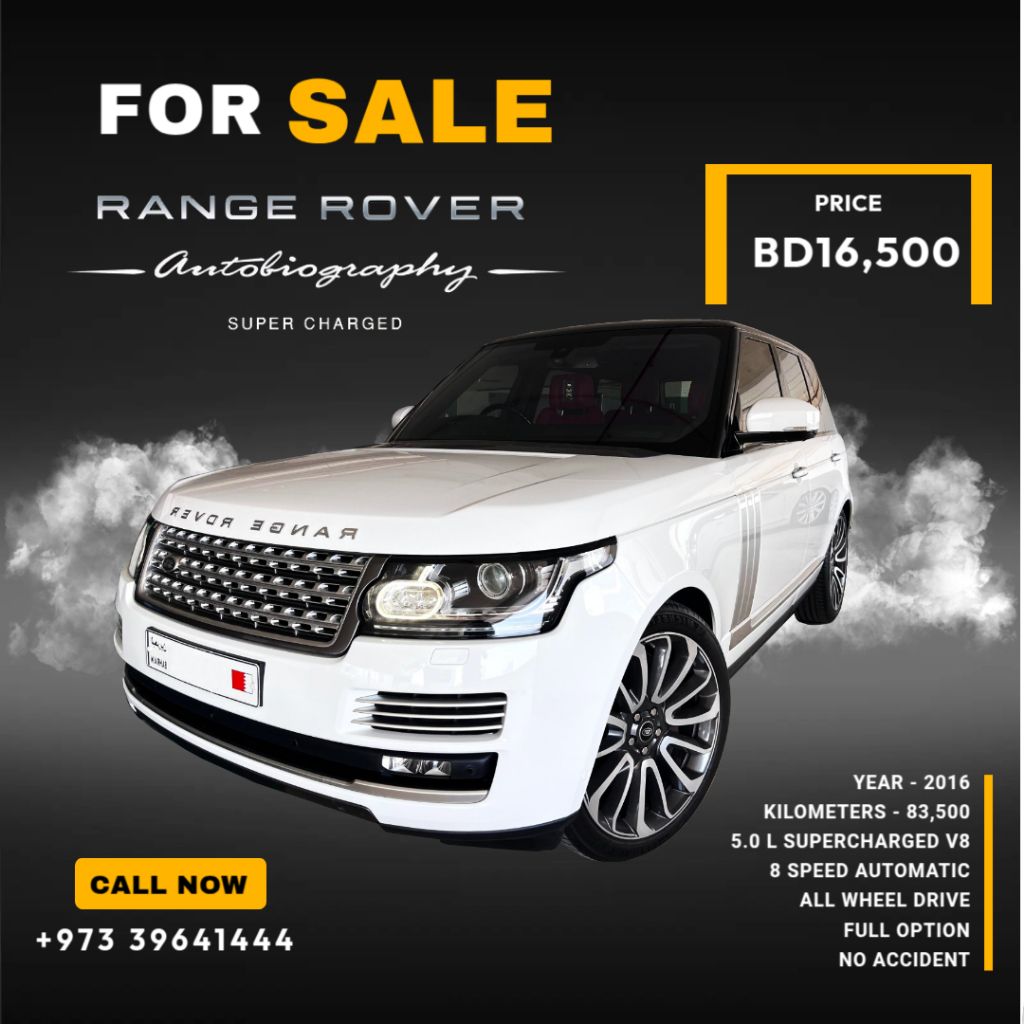 Range Rover Autobiography Supercharged - 2016 for sale in Bahrain. Price: 16,500 Bahraini Dinars only. Registered in Bahrain with only 83,500 km mileage, accident-free. Luxury red leather interior, full specifications in showroom condition. Key specifications and features: Engine and Performance: 5.0L V8 Supercharged gasoline engine, 510 HP (503 BHP), 625 Nm torque, 8-speed automatic transmission, permanent all-wheel drive (AWD), air suspension system.