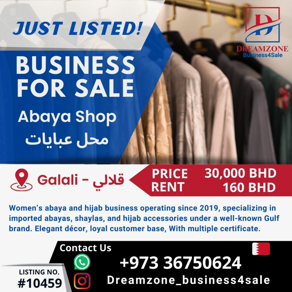 للبيع مشروع مربح لبيع العبايات والشيلات في منطقة قلالي. يعمل منذ عام 2019، جاهز للتشغيل مع زبائن دائمين، بضاعة مستوردة، حسابات تواصل اجتماعي، ونظام نقاط البيع. يشمل السجل التجاري، المخزون، والمعدات.