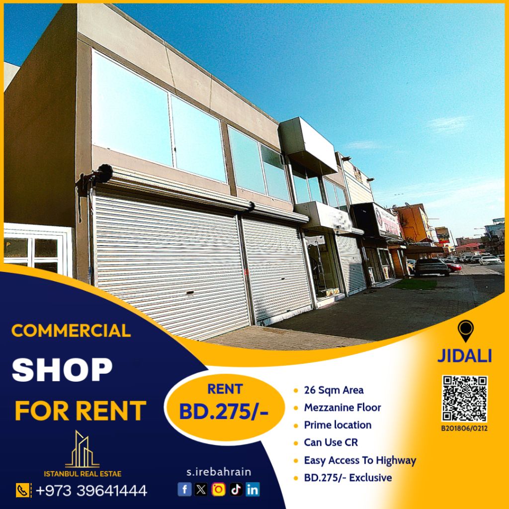 محل تجاري (26 متر مربع) للإيجار في جد علي موقع متميز 270 دينار بحريني. يقع هذا المحل التجاري في جد علي بالقرب من توبلي موقع متميز. تبلغ مساحته 26 متر مربع مع طابق نصفي، يمكن استخدام السجل التجاري للأنشطة التجارية مثل التجارة والمكتب والمعرض التجاري ومتجر البيع بالتجزئة والمخزن البارد وما الى ذلك. توجد مواقف للسيارات أمام المبنى، وسهولة الوصول الى توبلي ومدينة عيسى وسلماباد والزنج وغيرها. الإيجار 270