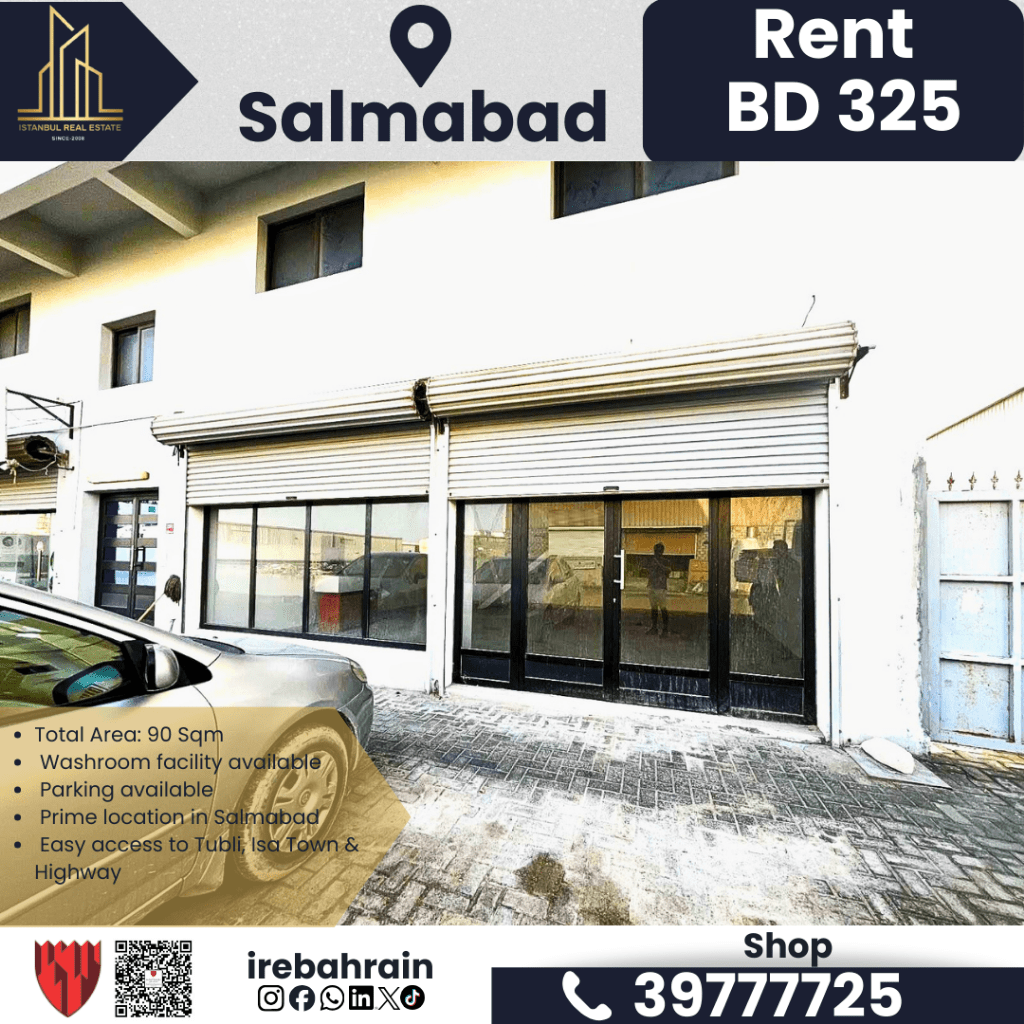 عقار تجاري مع طابق نصفي للإيجار - سلماباد. الإيجار 325 دينار بحريني شهرياً (بدون رسوم الكهرباء والماء). المساحة الإجمالية 90 متراً مربعاً: الطابق الأرضي 53 متراً مربعاً، الطابق النصفي 37 متراً مربعاً. مناسب لأي نشاط تجاري. دورات مياه متوفرة. موقف سيارات متوفر. موقع متميز في سلماباد، مع سهولة الوصول إلى توبلي، ومدينة عيسى، والطريق السريع. للتواصل.