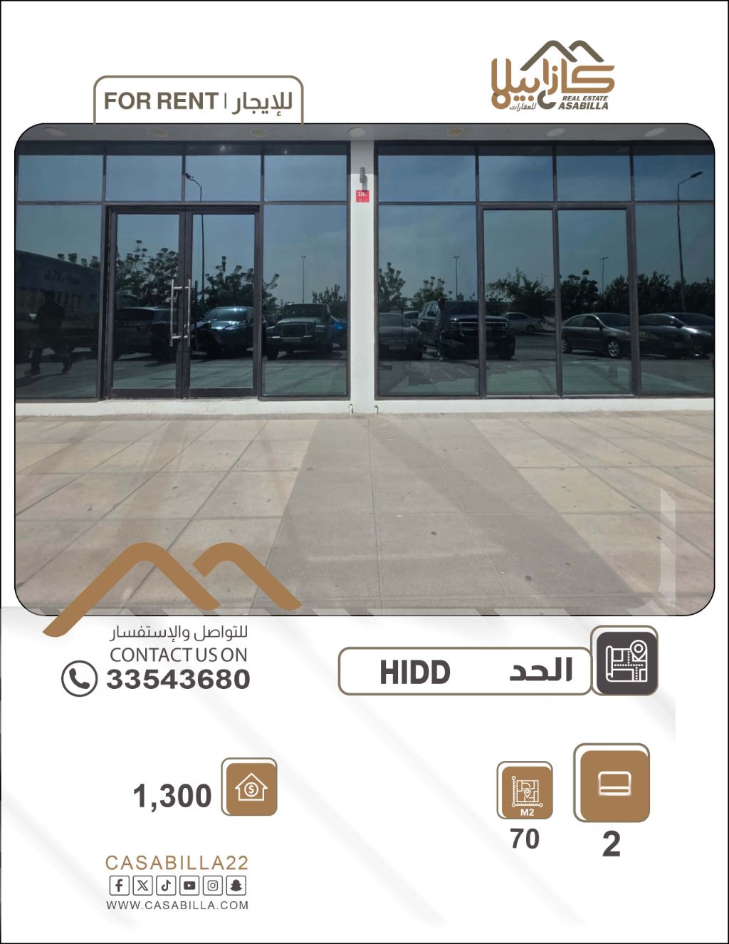 للإيجار: محلين تجاريين في موقع مميز وحيوي جداً في منطقة الحد. مساحة المحلين الإجمالية 70 متراً مربعاً، وتشمل محلين وميزانين. يوجد مواقف للسيارات على الشارع الرئيسي. سعر إيجار المحلين 1300 دينار. للتواصل.
