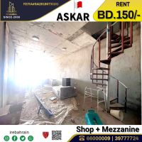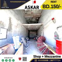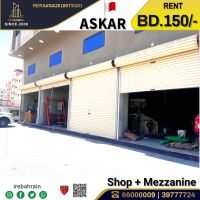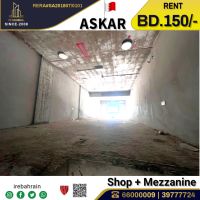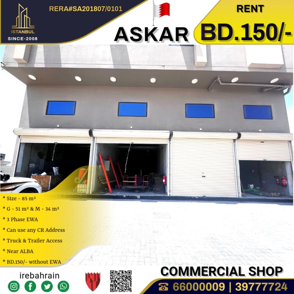 A commercial/ Industrial shop for rent in Askar, near ALBA, for 150 Bahraini Dinars. This property is located in the Askar area, behind ALBA, with an area of 85 SQM, consisting of a ground floor of 51 SQM and a mezzanine floor of 34 SQM. It can be used for any residential address, with three - phase electricity and water connections. Access is available for trucks and trailers