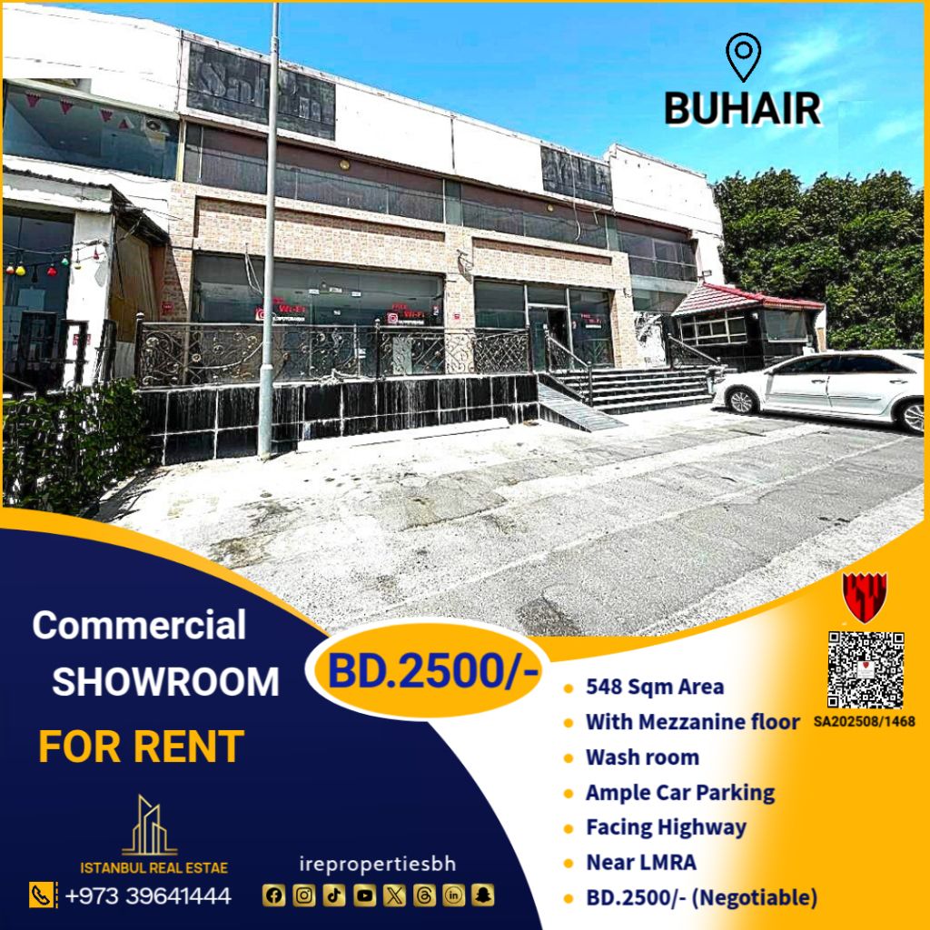 Commercial exhibition space for rent in Al Riffa, Bahrain. The total area is 548 SQM, with 275 SQM on the ground floor and 273 SQM on the mezzanine floor. It includes a bathroom, ample parking, and a prime location facing the Highway. Nearby landmarks include the Labor Market Regulatory Authority (LMRA) in Al Riffa. The rental price is 2500 Bahraini dinars (negotiable)