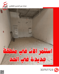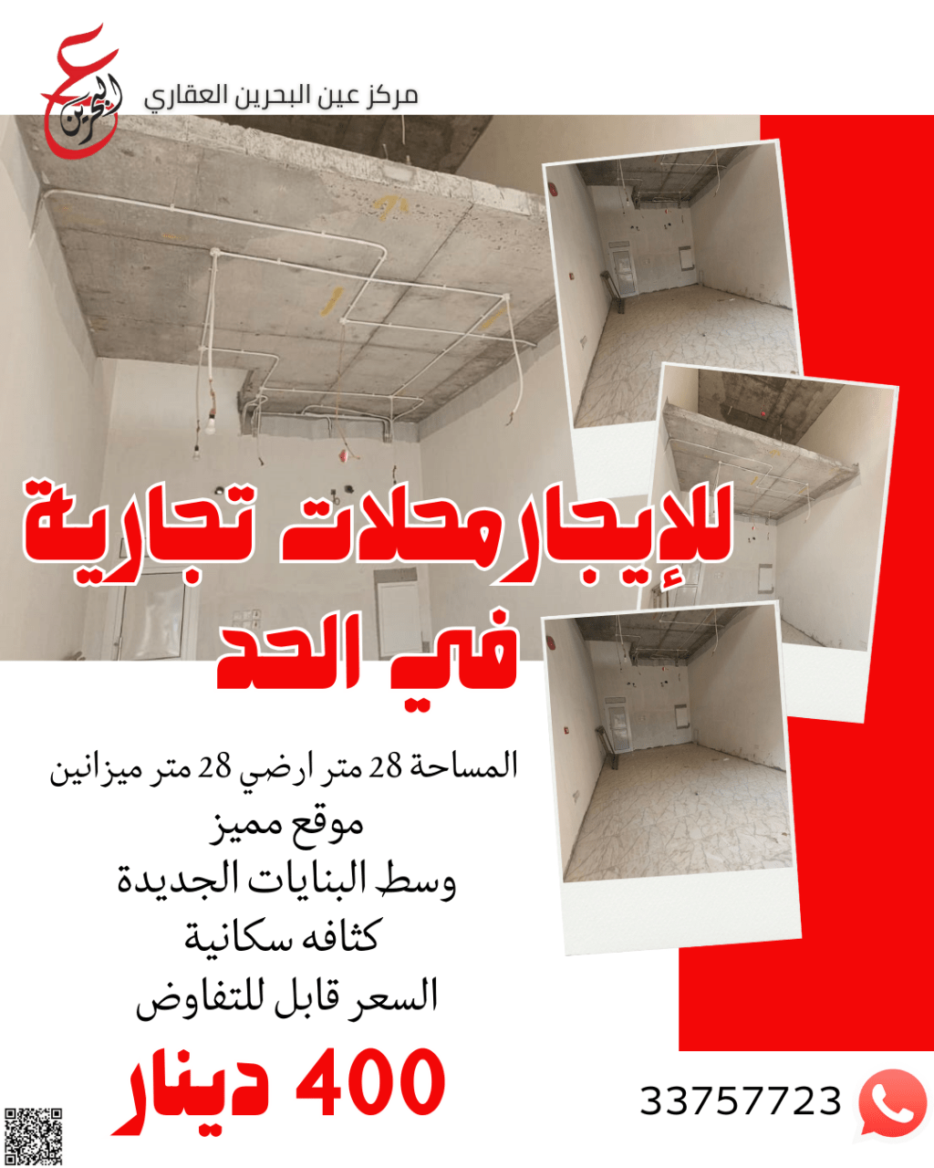 For rent: commercial shops in Al-Hadd, the new area, centrally located among buildings with high population density. Area: 28 square meters, mezzanine. Parking spaces available. Price: 400 dinars, negotiable.