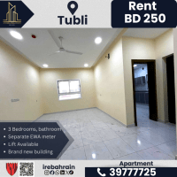 Family apartment for rent - Tubli, 250 Bahraini Dinar (excluding electricity and water). A new family apartment containing 3 bedrooms, 3 bathrooms, a spacious living room, a closed kitchen, elevator available, private parking, separate electricity and water meters, surveillance cameras. For families only. Prime location in Tubli, easy access to Ansar Gallery, near Al-Anwar Discount Center, close to Jid Ali and Manama. Rent is 250 Bahraini Dinar per month (excluding electricity and water). For contact.
