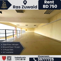 A showroom + mezzanine floor for rent - Ras Zuwayed, 750 Bahraini Dinars. Location: Ras Zuwayed, opposite Alba. Total area: 148 square meters. Ground floor: 74 square meters. Mezzanine floor: 74 square meters. Air conditioning available. Toilets. Car parking. Three-phase electricity. Rent: 750 Bahraini Dinars per month. Easy access to Askar, Sitra, Riffa, and Sand. For contact.